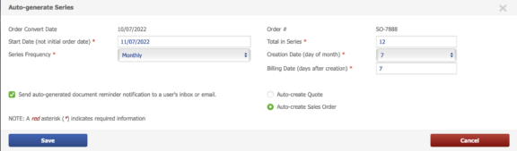 Auto-generate Orders (NEW). Auto-generated quotes and orders will give the sales representative and their end customer the ability to make changes to recurring service order. Setting up orders for auto-generation is simple. Make certain that your initial order has all the service items that need to be sold and billed on a recurring basis. All the products and payment options on that order will be transferred onto a new Quote (or Sales Order) on a scheduled basis for modifications. To enable this feature, go to Admin > Company Settings > Documents > and expand the Sales Order section. Click on the checkbox for “Enable Convert to Auto-create for the automatic generation of Quotes or Sales Orders in a series.“ Then select your defaults in the three rows beneath it. When enabled, Sales Orders will have a “Create Auto Series” button will be added to the footer section. Selecting this button opens the Auto-generate Series modal with create auto-generate options.