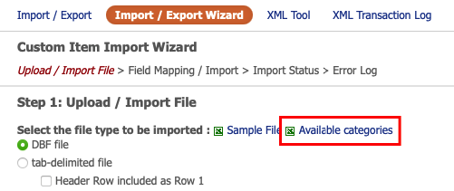 Well, to get an up to date version of the category names and codes you are using, there is a simple download that you can grab. To find it, go to Admin > Import/Export Wizard > Custom Item Import. In Step 1, there is an “Available categories” download link. Once you click on that the file will be automatically downloaded to your system. With the file are two columns; one for ID, and the other for category name.