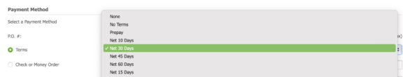 Ability to change payment terms options on quote. To use this when making quotes, click edit icon in header by Order Options, navigate to the Terms radio button (if enabled) and select the term length from the dropdown.