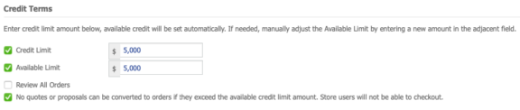 Credit Hold. It is now possible to stop quotes from being converted to orders if the customer is over their credit limit. An Account level setting, located in the Tax & Payment edit page (and Payment Settings widget), appears under the Review All Orders check box in the Credit Terms section. New checkbox option is labeled: “Credit Hold. No quotes or proposals can be converted to orders. Storesite users will not be able to checkout.” This status is viewable in the account view’s Payment Settings widget with the new field Credit Hold positioned under the Review All Orders line. When enabled the “Convert to Order” button will not be available on the quote footer. Store users will see the Credit Hold warning message at the top of the cart prior to being able to Checkout.