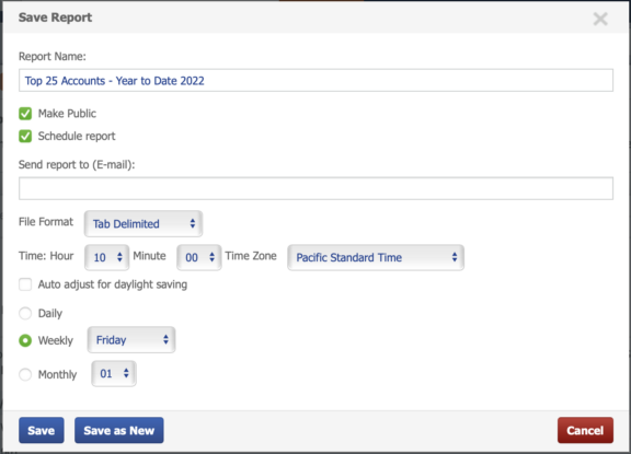 Share Reports. The sharing of reports is easy, when you save a report make sure you select the “Public” setting on the Save lightbox. Public Saved Reports will become viewable by other users to run and add to their dashboards. For visibility we added a new column to Saved Reports list page called “Created By” and two dropdown filters for “Type” and “Created By”. Once a user selects that report, that user will see results of the original SalesRep creator. Shared reports can be copied and modified by any other user, but it will not be shared by default, the user will need share it as new if others want to use it.