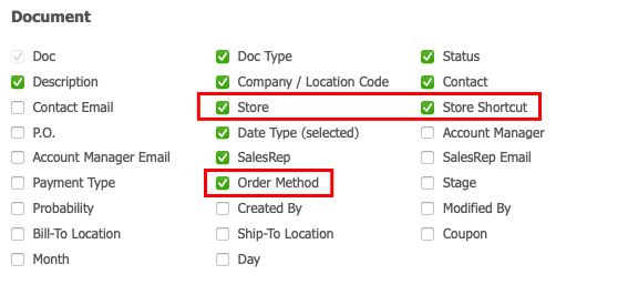 - Assigned storesite reporting. When running Sales reports there are now selectable columns for your storesite information. Chose to either Store, for the name of the store, or Store Shortcut for the URL string used to ID the store. Additionally there is a new Store Method column that will tell you have that order was placed. Methods include: Store, Sales, Guest, Punchout, Esign, and any empty values reflect old orders prior to implementation.