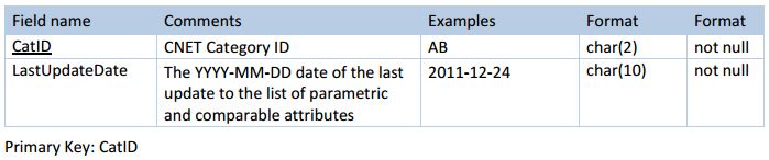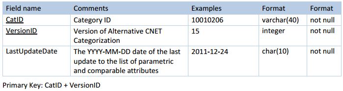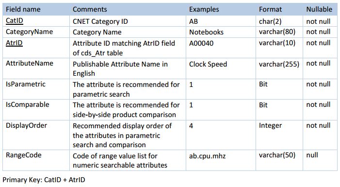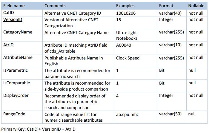 The table defines searchable and comparable attributes for each of the Alternative DataSource categories delivered in cds_Cct_Products of download.zip.