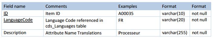 The table provides translations of attribute names to all of the supported languages.