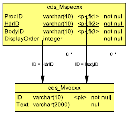 The cds_Mvocxx table is the vocabulary table for Mspecxx. Each Hdrid, and Bodyid in Mspecxx can be translated into text by linking to this table