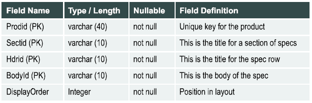 The main specifications (cds_Mspecxx table) contain the “must have” information that shoppers want to see when making a purchasing decision.